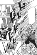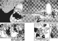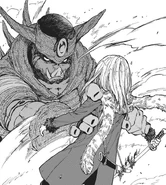 Rimuru charges in jumping and slashing the sword down, but Geld blocks it even as Rimuru covers his blade with Black Flames. Geld pushes Rimuru away as Geld screams how Rimuru is a chaos eater. Benimaru notices in disbelief that Geld's severed arm isn't regenerating. While Rimuru avoids Geld's Death-March Dance attacks, Hakurou states an observation that the black flames smoldering in the wound are most likely keeping it from regenerating, but is also cauterizing it so it wouldn't lead to it as a fatal wound though. He also observes that those flames are a more complicated magical manipulation than a simple single burst of extreme heat. He notes to himself that he didn't think Rimuru was the kind of person whose magical power was enough to be able to have sufficient ability to manipulate magic and still had a ways to go, but realizes that watching Rimuru fight seems like he's a whole different person. Geld launches more Death March attacks, but Benimaru notices and shouts to the others that the attack also includes a corrosion effect and to not touch it. The attack lands on the battlefield at Rimuru's group which is dodged and has the battlefield in a smoke-filled air. As Rimuru looks on, Geld's hand suddenly launches through the smoke grabbing his whole torso while the other hand grabs Rimuru's arm that is holding his weapon. As Geld shows his satisfaction at finally catching Rimuru, Ranga calls out drawing attention to how Geld's arm has regenerated. Hakurou surmises that Geld ate his own arm to remove the flames, much to Benimaru's disgust. Geld's army begs him to hurry and use Starved as they are hungry for it. Geld asks Rimuru if it's a shame that he's going to be eaten explaining how things eaten by Corrosion and Starved will nourish the army while rotting and dying just as Rimuru's hands seemingly starts to melt. Rimuru quietly says "No", places his seemingly melted hand on Geld's arm where its melted form crawls up it. He then activates Flare Circle and engulfs both of them to a shocked Geld. While Geld starts disintegrating from the flames as Rimuru holds him, he reflects complimenting Great Sage at partially undoing his transformation to make it seem that he was being corroded and as Geld doesn't have resistance to fire, all he has to do is hold him until Geld burns out while in his slime body to win. Rimuru hesitates and considers that Great Sage may have overlooked that Geld may have acquired Heat Resistance, which was confirmed by the Voice of the World. As Great Sage prompts a revision of strategy, Rimuru commands to take control from Great Sage's auto battle mode, but reflects to his "partner", Great Sage, to not be disappointed as he now knows a strategy to defeat Geld thanks to it and to leave the rest to him. Geld declares flames will not harm him, and disperses Flame Circle. Rimuru transforms completely to his slime body, melting over Geld's arms. Seeing this, Shion calls out in concern about to leap in, but Hakurou tells her to stop, pointing out that if she closely looked she would see that Rimuru melting isn't because he was corroding, As Rimuru envelops Geld, he tells Geld how he's originally a slime and eating is also his specialty. Great Sage prompts that Rimuru is using Ultraspeed Regeneration to heal corroded parts, but that Geld is also using Self-Regeneration to heal corroded parts as well. Just as Great Sage was going to prompt the probability of corroding Geld first, the scene changes to a flashback of Geld's, which Rimuru can view.